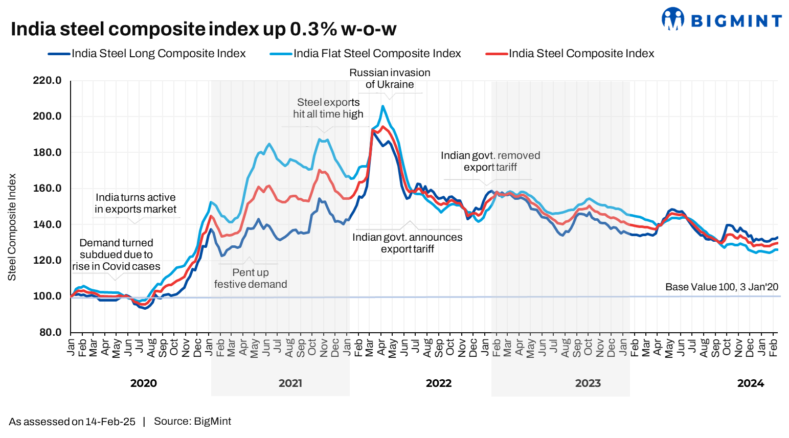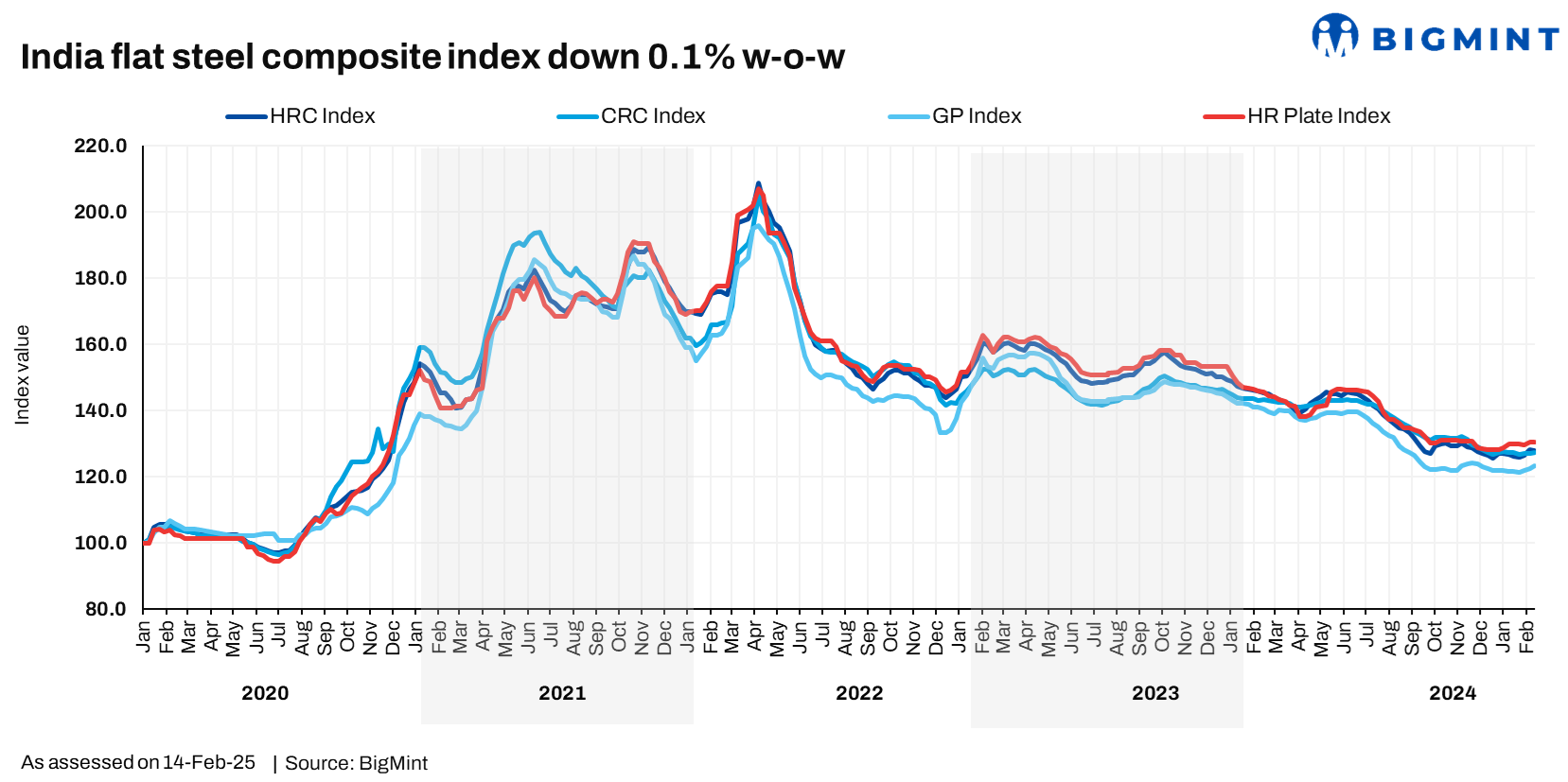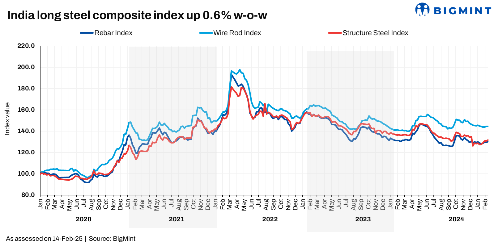 Morning Brief: BigMint’s Steel Composite Index remained range-bound against the previous week, gaining by a mere 0.3% to settle at 129.7 points on 14 February 2025. The index continued to make slow recovery, primarily on the back of a buoyant induction furnace (IF) rebar market.